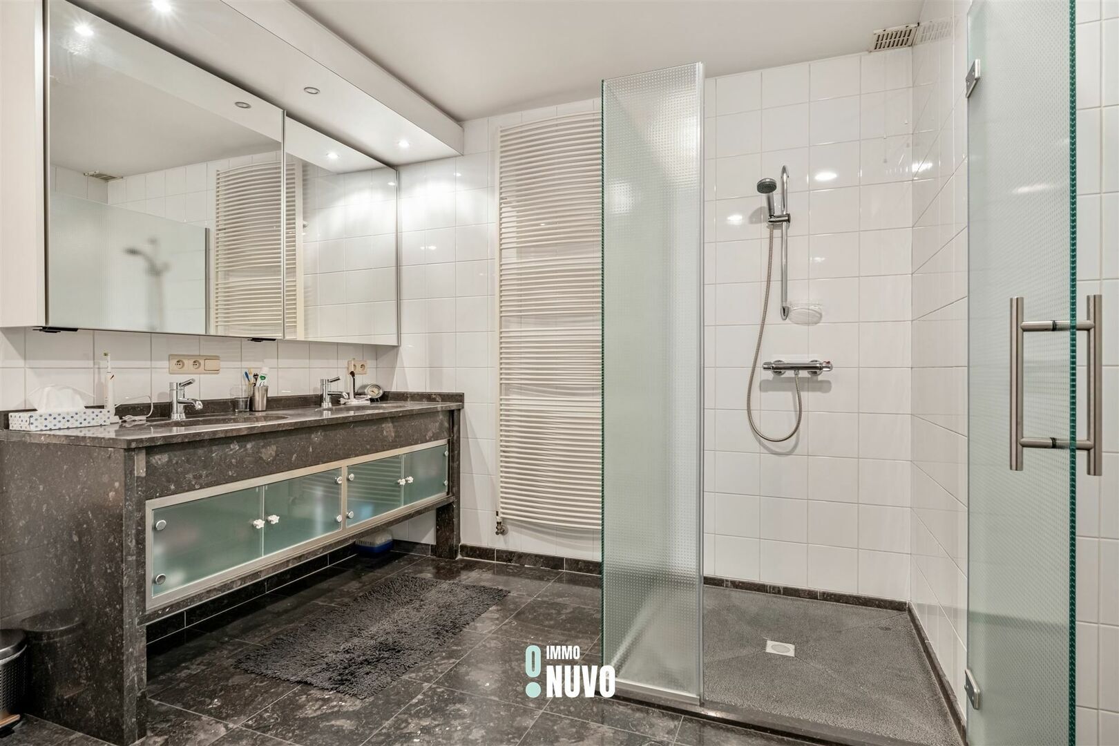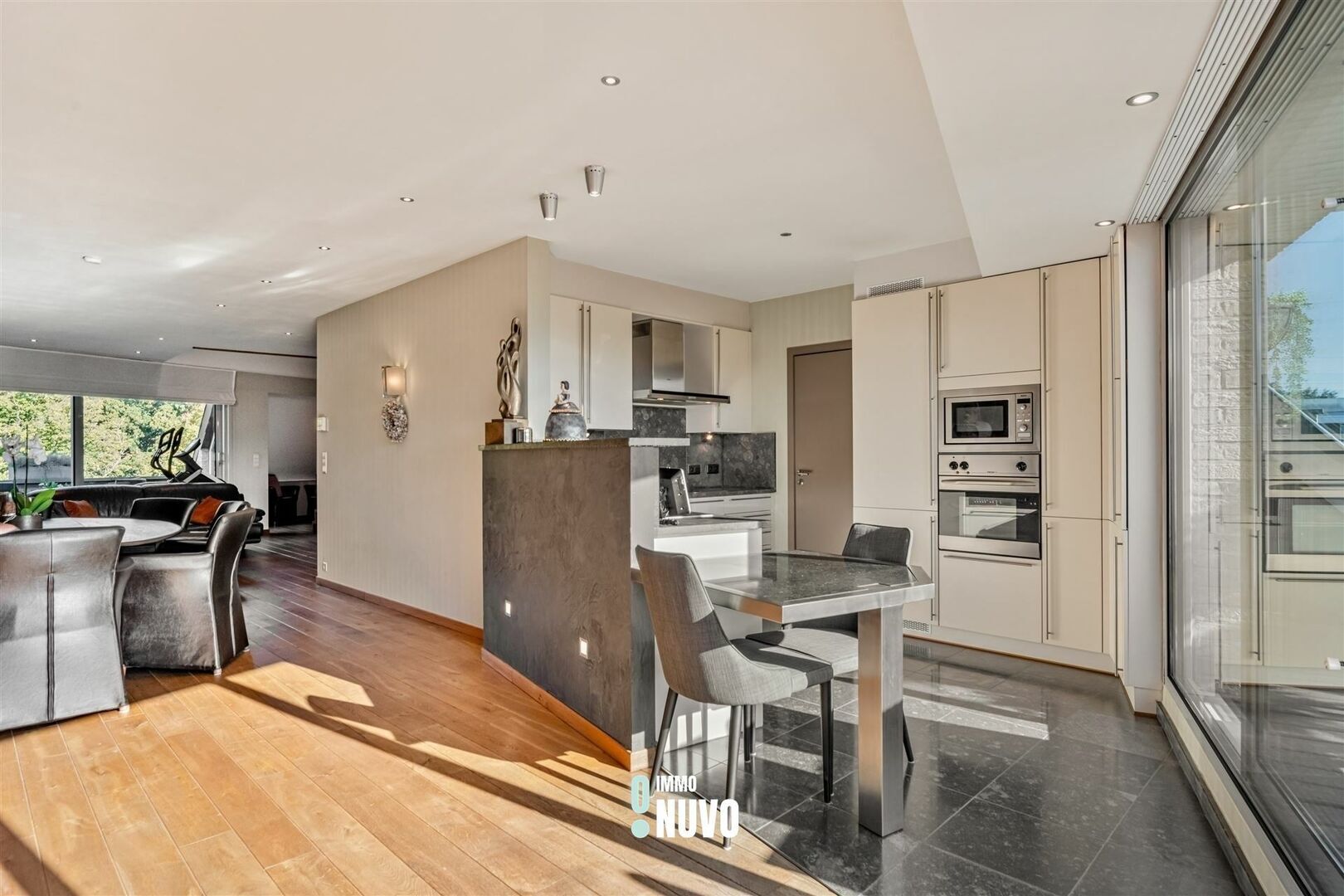 La finition luxueuse donne à cet appartement une sensation chaleureuse. En entrant dans le hall d'entrée, on ressent immédiatement l'espace de l'appartement. L'espace de vie lumineux est relié à la cuisine semi-ouverte, qui est équipée de tous les conforts. Des deux côtés de l'espace de vie, vous pouvez profiter de la tranquillité et de l'intimité des terrasses spacieuses.
