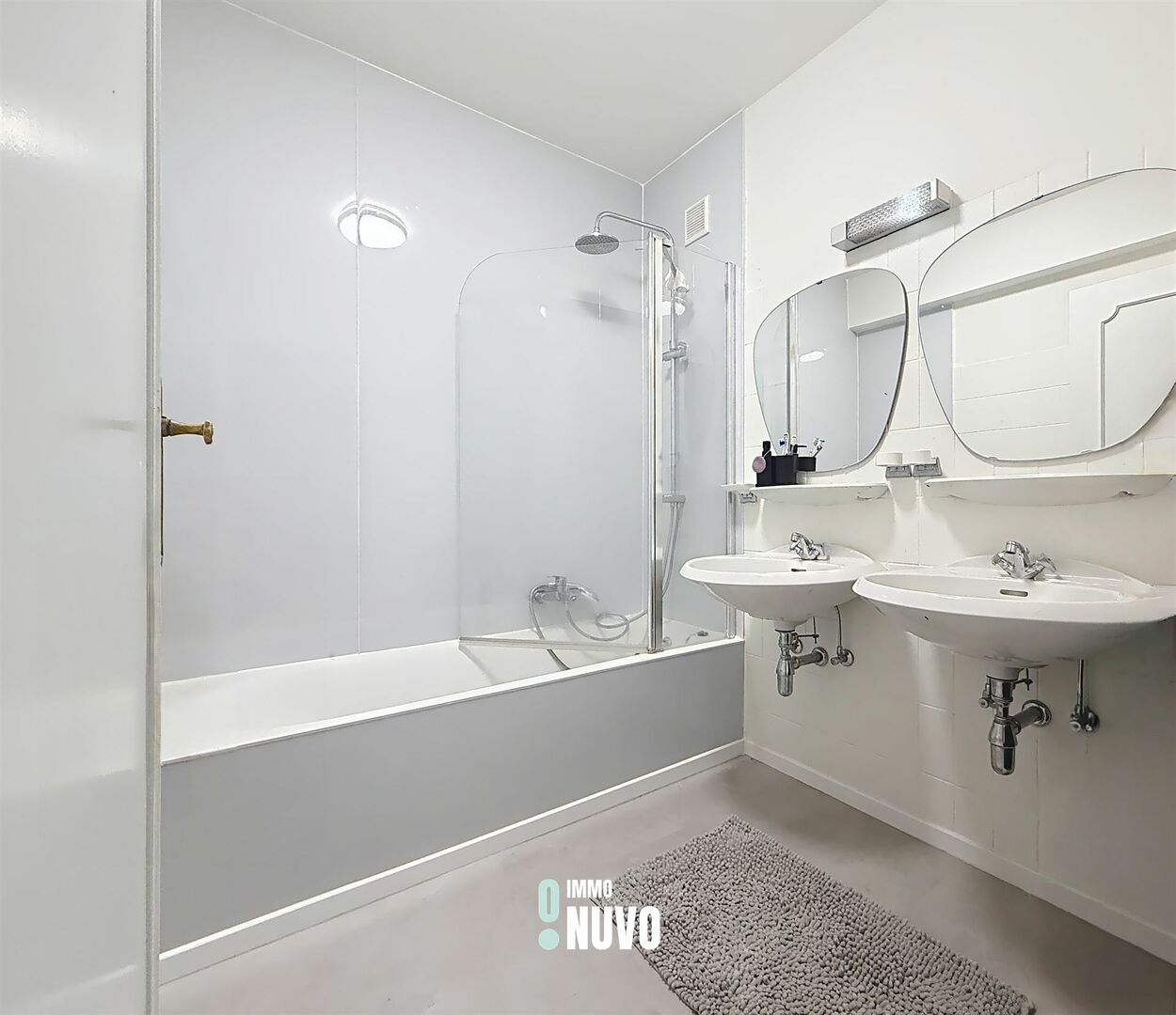 De badkamer is compleet uitgerust met een douche in bad en een dubbele lavabo.