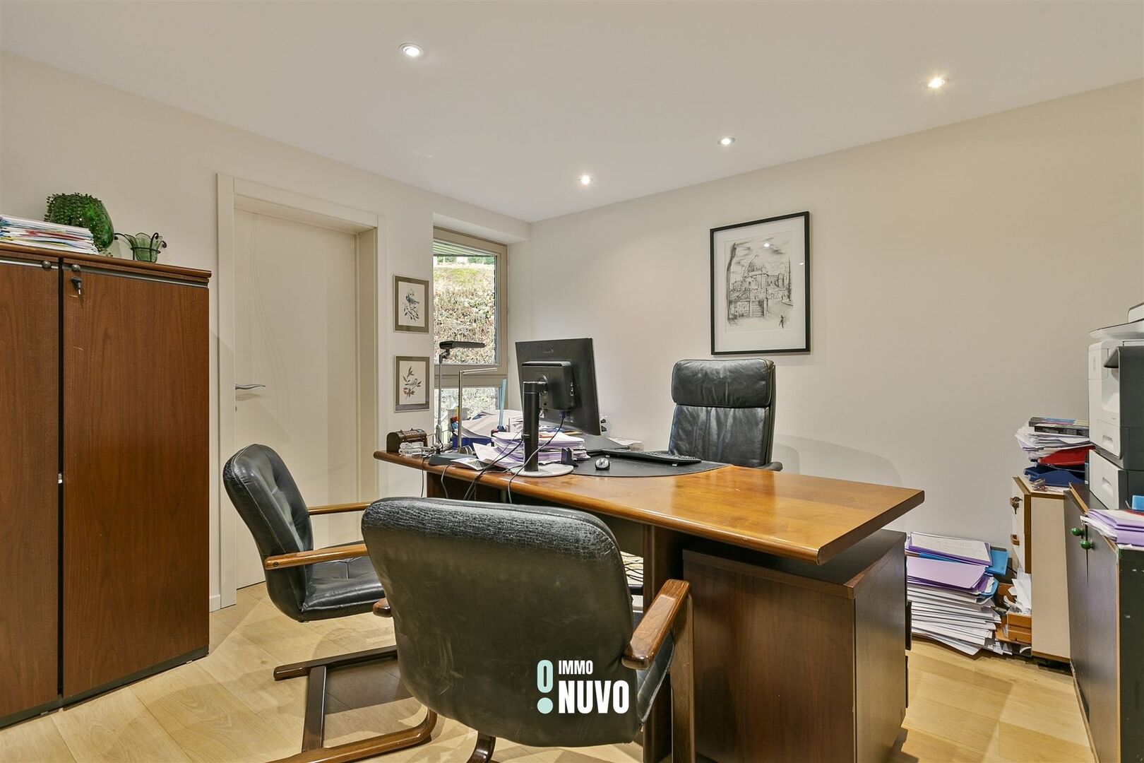 De woning beschikt op het gelijkvloers van een ruime inkomhal, gastentoilet, twee woonkamers, een bureau/slaapkamer met een ensuite badkamer, eetkamer, volledige uitgeruste keuken en een bureau