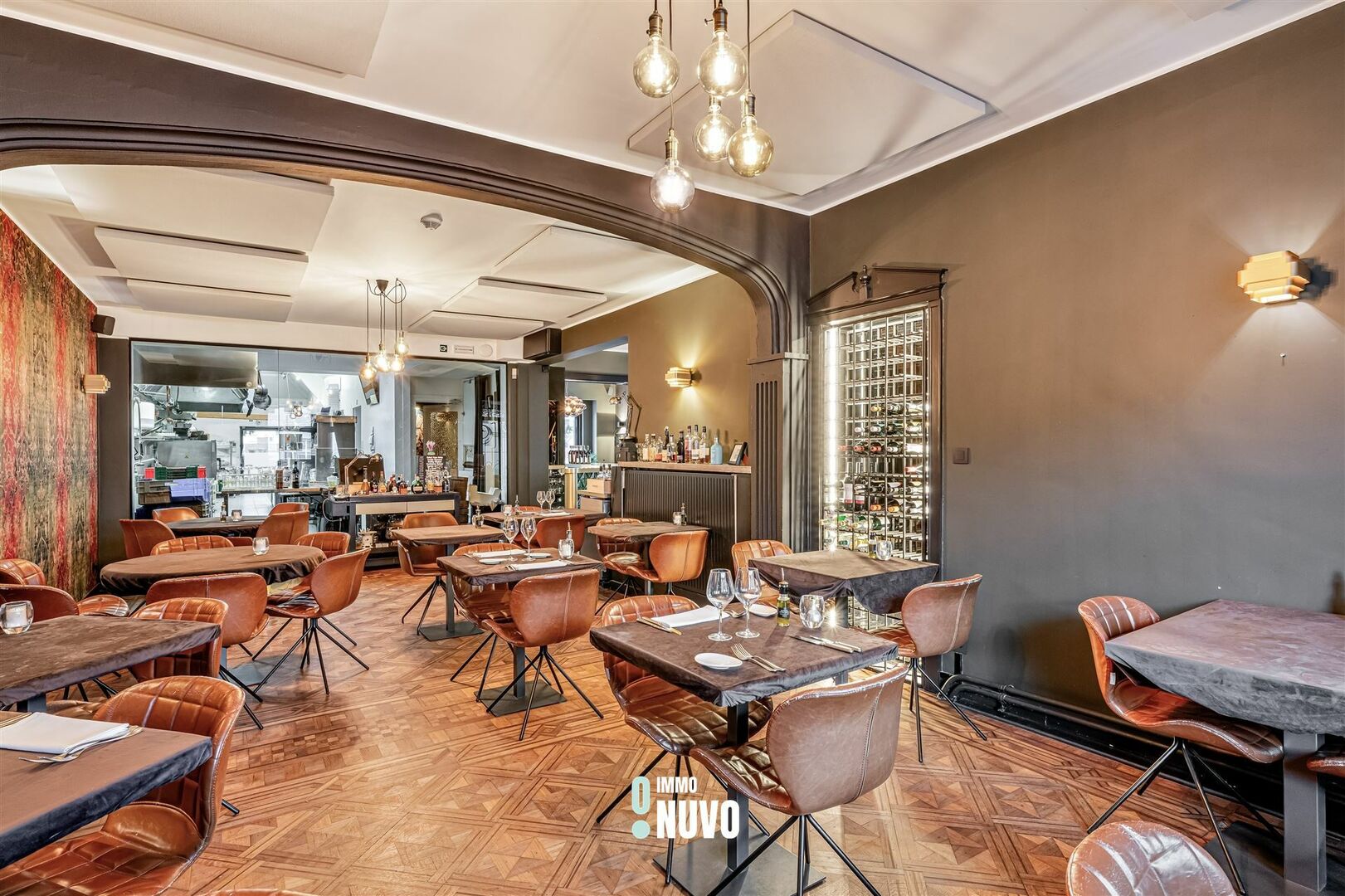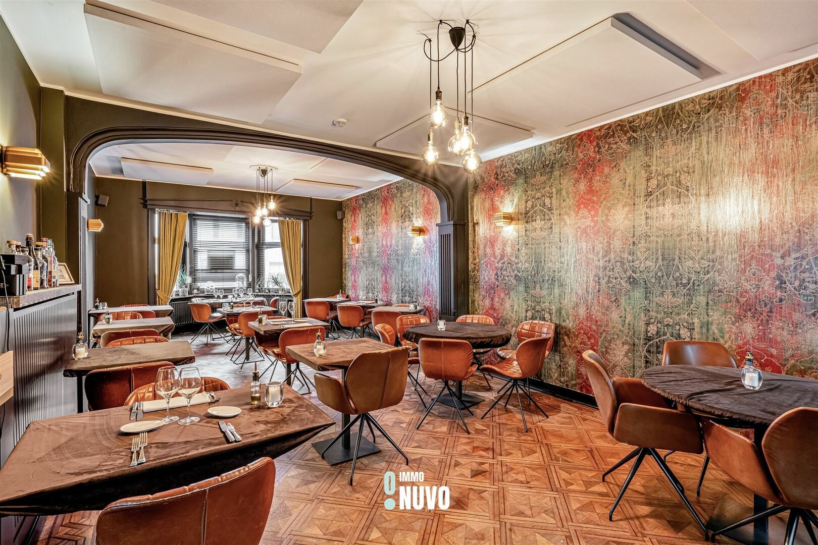 Het gelijkvloers omvat een impressionante inkomhal met een majestueuze trap, het gastentoilet, de ruime tweeledige restaurantzaal met een bar/ontvangstbalie als eye catcher en tal van authentieke elementen zoals het oorspronkelijke parket, een open functionele keuken, een praktische kelderruimte en een handige berging.