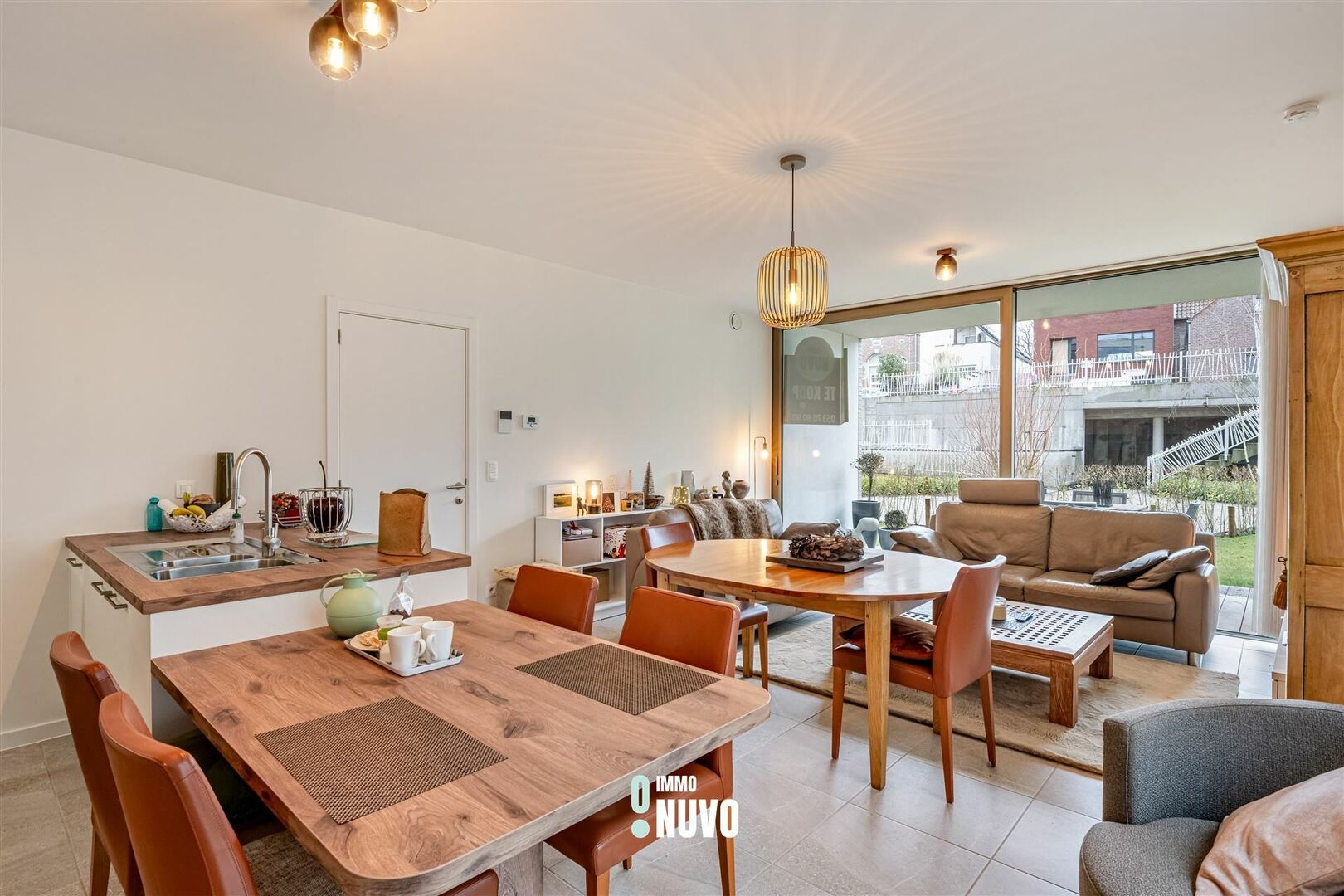 De ruime, lichtrijke leefruimte sluit naadloos aan op een strakke open keuken, uitgevoerd met kwaliteitsmaterialen en moderne toestellen. Grote raampartijen zorgen voor een overvloed aan natuurlijk licht en een aangenaam gevoel van openheid.