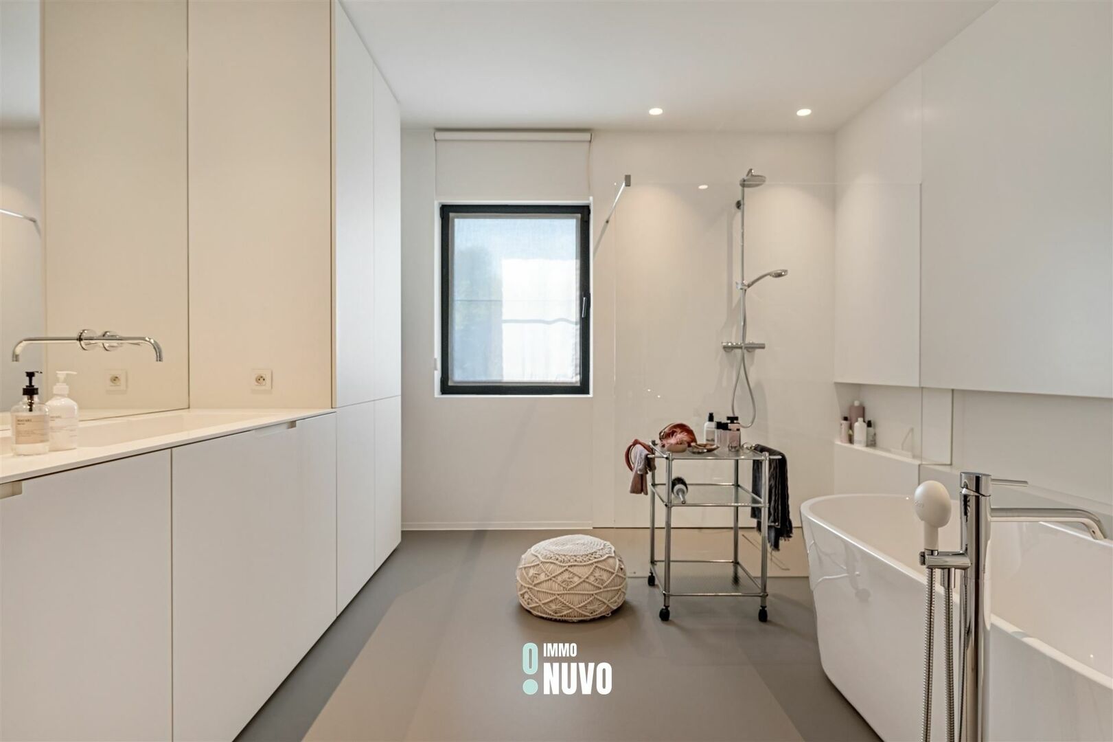 Op het gelijkvloers: Inkomhal met vestiaire en toilet.Een grote leefruimte die van veel lichtinval geniet voorzien van ingemaakte kasten, met aansluitend de volledig uitgeruste keuken.Verder zijn er 2 royaal bemeten slaapkamers die ook elk voorzien zijn van ingemaakte kasten en een luxe badkamer, met losstaand bad, inloopdouche en dubbele lavabo.